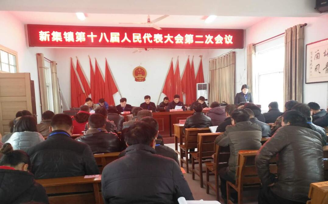 新集镇第十八届人民代表大会第二次会议于2017年12月27日胜利召开,会期2天。镇党委于12月22日就召开了专门会议,研究制定了人大例会工作计划,成立大会筹备工作领导小组,下设四个工作小组,秘书组、会务组、宣传组和治安保卫组。12月27日召开了预备会,28日召开了第一次和第二次全体会议,参加会议的代表66名,特邀和列席代表26名。